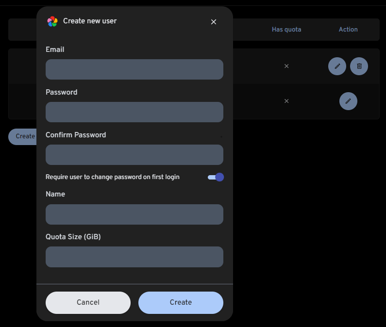In order to select a storage quota, click on the pencil icon and enter the storage quota in GiB. You can choose an unlimited quota using the value 0 (default).